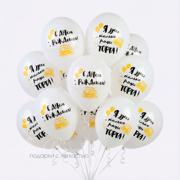 Стильные белые воздушные шары с золотыми надписями «С Днём Рождения!» и «Я здесь только ради торта!» станут ярким акцентом любой вечеринки. Украшенные изображением праздничного торта, свечей, шариков и игривыми надписями, эти шары подойдут для взрослых и подростков, добавят веселья и иронии в атмосферу праздника. Идеально подойдут для фотозоны, украшения зала или подарка имениннику с отличным чувством юмора!