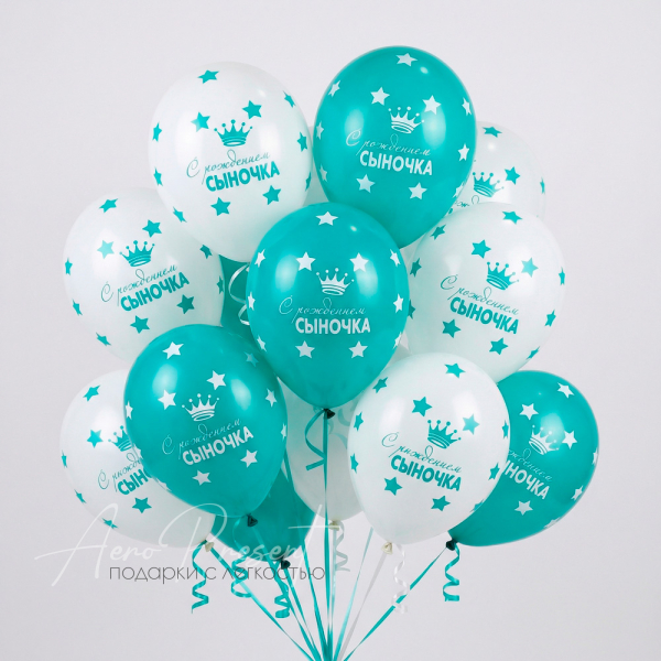 Очаровательные бирюзовые и белые шары с надписью «С рождением сыночка» украшены коронами и звёздочками. Такой воздушный букет идеально подойдёт для выписки из роддома, встречи мамы и малыша, украшения детской комнаты или проведения первой фотосессии. Шары создадут атмосферу радости, нежности и праздника, подчеркнут важность этого счастливого события и станут отличным дополнением к поздравлению семьи с появлением мальчика!
