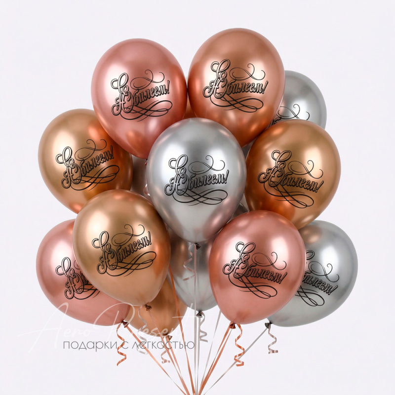 Эффектные шары с металлическим блеском и изысканной надписью «С Юбилеем!» отлично подойдут для украшения зала, фотозоны или праздничного стола на юбилее. Золотые, серебряные и бронзовые оттенки создают атмосферу торжественности и подчеркивают значимость события.