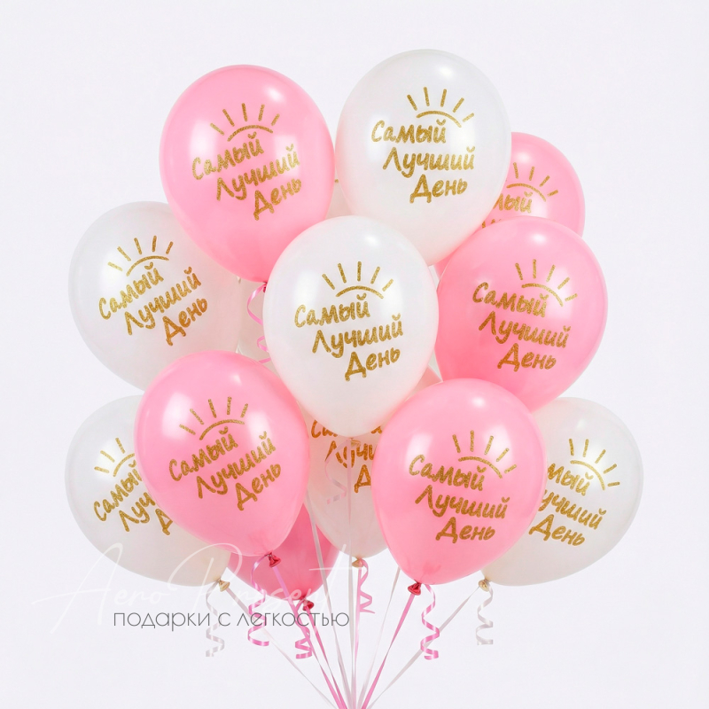 Нежные воздушные шары в молочно-белых и розовых оттенках с надписью «Самый лучший день» и сияющим золотым декором — универсальный вариант для любого праздника! Такой букет идеально подойдет для дня рождения, девичника, выписки из роддома, годовщины или просто как тёплый комплимент любимому человеку. Лёгкие и светлые цвета шаров создают атмосферу радости и счастья, а позитивная надпись обязательно подарит улыбки всем гостям.