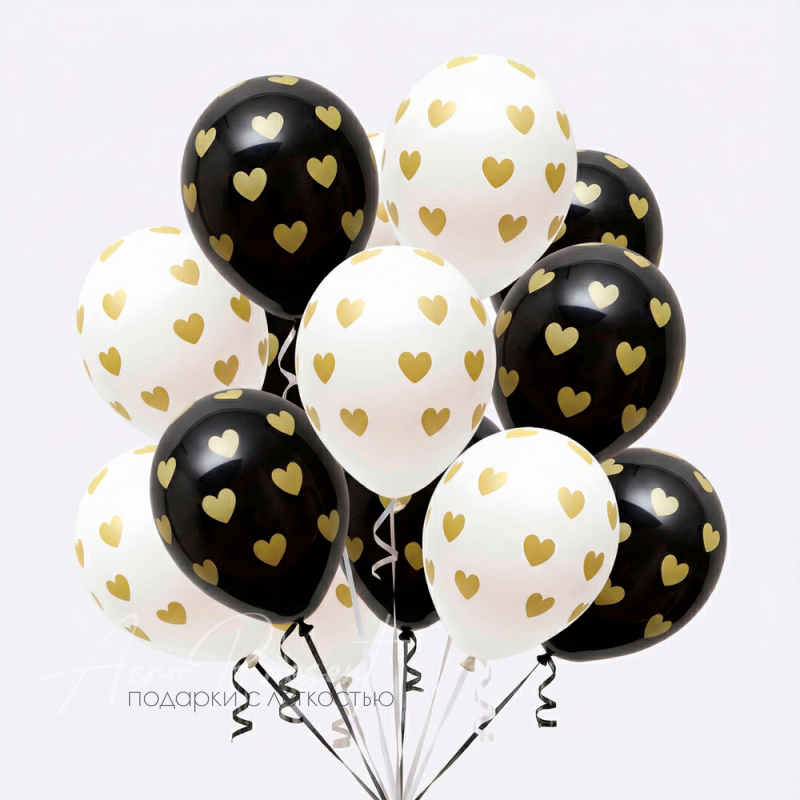 Стильные воздушные шары в черно-белой гамме с золотыми сердечками — идеальный выбор для особых случаев! Такой букет украсит романтический вечер, свадьбу, годовщину, вечеринку или фотосессию, придаст любому празднику нотки утончённости и изысканности. Лаконичный и современный дизайн подойдет как для женских, так и для смешанных мероприятий, делая атмосферу ещё более тёплой и праздничной.