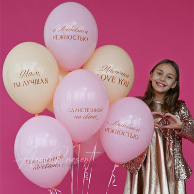 Нежные пастельные шары с золотыми надписями-комплиментами “Мам, ты лучшая”, “С любовью и нежностью” и др. создают трогательную атмосферу и выглядят очень фотогенично.