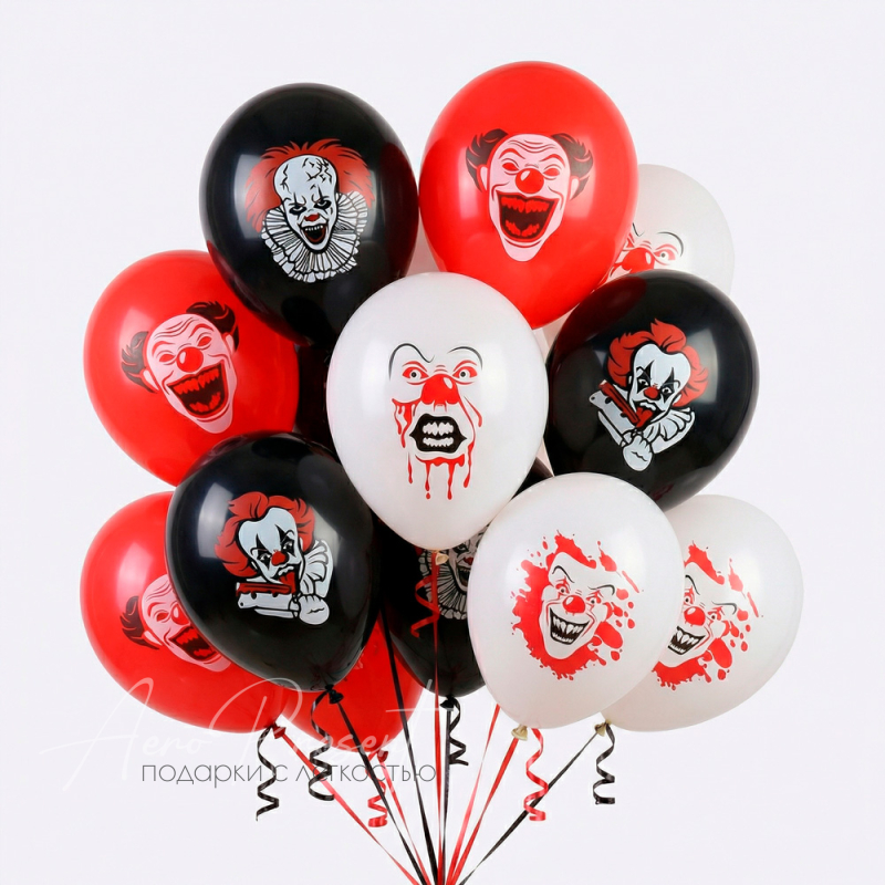 Зловещие воздушные шары с изображениями пугающих клоунов создадут мрачную атмосферу на Хэллоуин, тематической вечеринке или празднике в стиле хоррор! Агрессивные лица, гримасы и кровавые детали на шарах в красных, чёрных и белых тонах впечатляют и приковывают внимание гостей. Такой букет станет неотъемлемым элементом устрашающего декора, подойдет для оформления зала, фотозоны или розыгрыша.