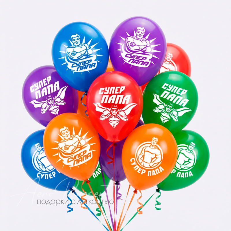 Яркие воздушные шары с надписями «Супер Папа» и изображениями супергероя — отличный способ поздравить и порадовать любимого папу! Шары в насыщенных цветах (синий, фиолетовый, оранжевый, красный, зелёный) идеально подойдут для оформления праздничного утра, семейного торжества или любого события, посвящённого папе. Такой букет создаст атмосферу признательности, веселья и гордости за самого крутого супергероя в жизни каждого ребёнка.