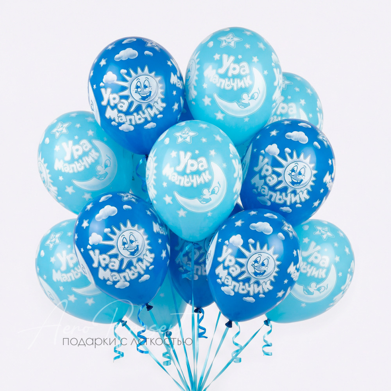 Яркие воздушные шары в голубых и синих тонах с надписью «Ура, мальчик!» и забавными рисунками солнца, облаков, звёзд и месяца — идеальный выбор для встречи новорождённого из роддома, baby shower или первого дня рождения мальчика. Такие шары легко создадут атмосферу радости и торжества, подчеркнут важность и счастье момента для всей семьи. Букет прекрасно подойдёт для украшения дома, фотозоны или подарка родителям.