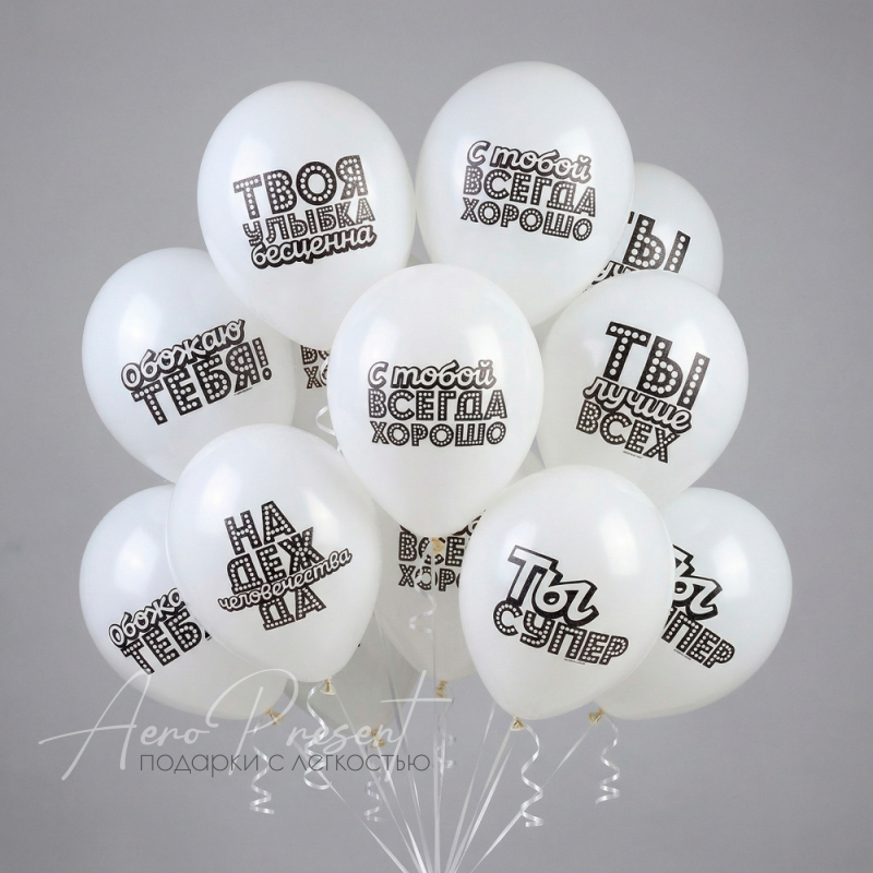 Белоснежные воздушные шары с позитивными надписями-комплиментами: «Ты супер», «Ты лучше всех», «С тобой всегда хорошо», «Твоя улыбка бесценна», «Обожаю тебя!», «Надежда человечества». Такой букет создаст атмосферу радости и вдохновения, станет отличным подарком для друзей, коллег, любимых и близких. Универсальный стиль и добрые слова подойдут ко дню рождения, в благодарность или просто для поднятия настроения!