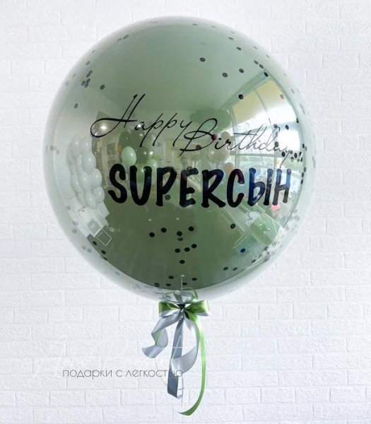 Оригинальный стеклянный шар с наполнением блестками и дизайнерской надписью на нем.