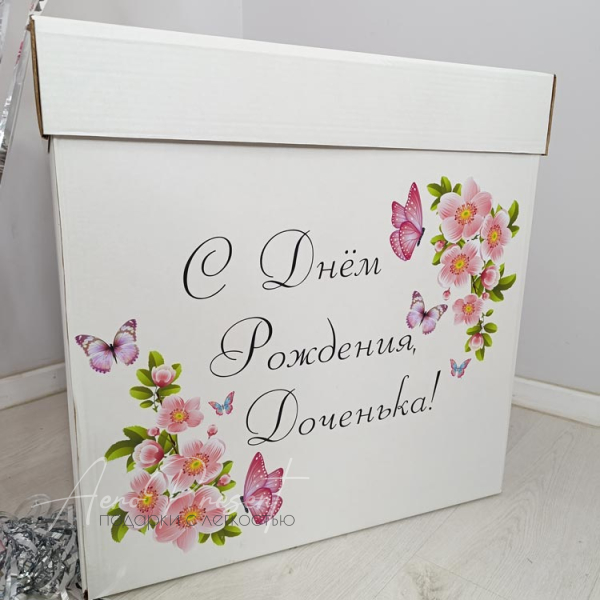 Размер коробки 60*60 см., в коробку помимо шаров можно поместить ваш подарок, вы можете это сделать самостоятельно, либо привезти его к нам в мастерскую и мы положим его внутрь к шарам.