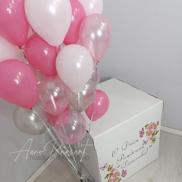 Коробка - сюрприз с дизайнерским нанесением и наполнением 30 шарами в розово серебристых тонах.