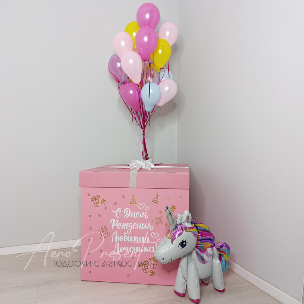 - 20 мини воздушных шаров внутри коробки, количество шаров по запросу можно увеличить, внутрь коробки помещается до 80 шаров