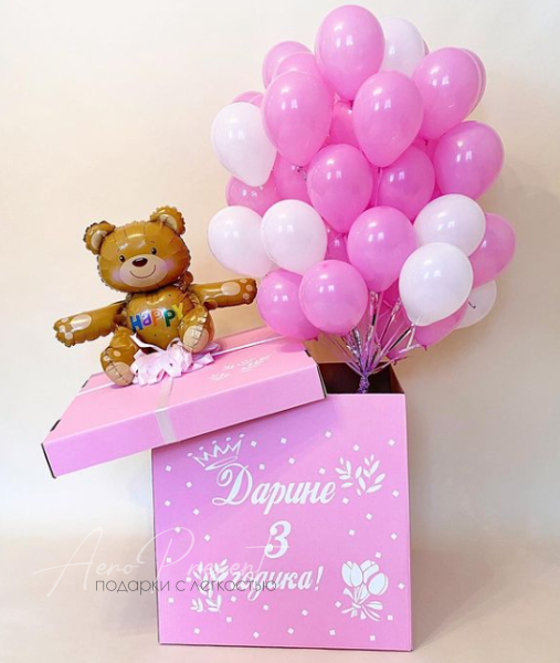 - Наполнение коробки выбранным количеством МИНИ шариков, помещается внутрь до 70 штук, время полета таких шаров до 24 часов, по запросу наш менеджер рассчитает стоимость набора с наполнением шарами стандартного размера;