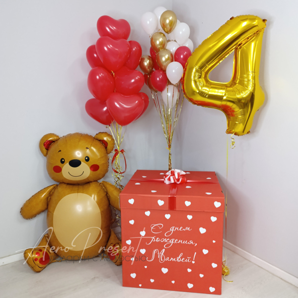 - Большая коробка размером 70*70 см. с нанесением поздравительной надписи, крышка украшена бантом.