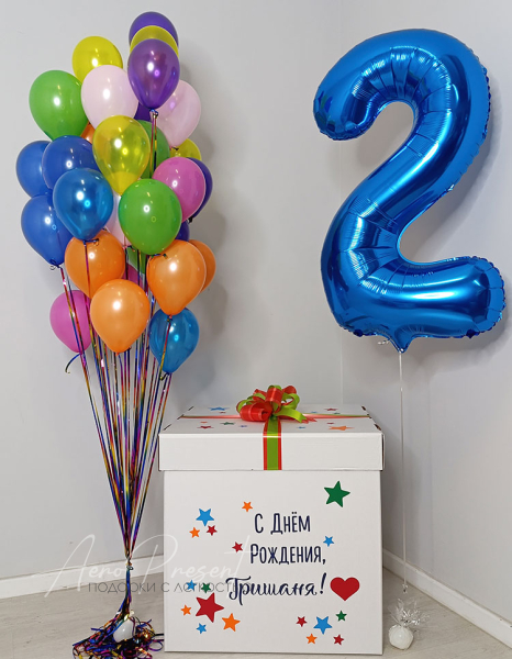 Яркая коробка с 30 цветными воздушными шарами, которые эффектно взлетят ввысь когда именинник откроет крышку. Размер коробки 60*60 см.