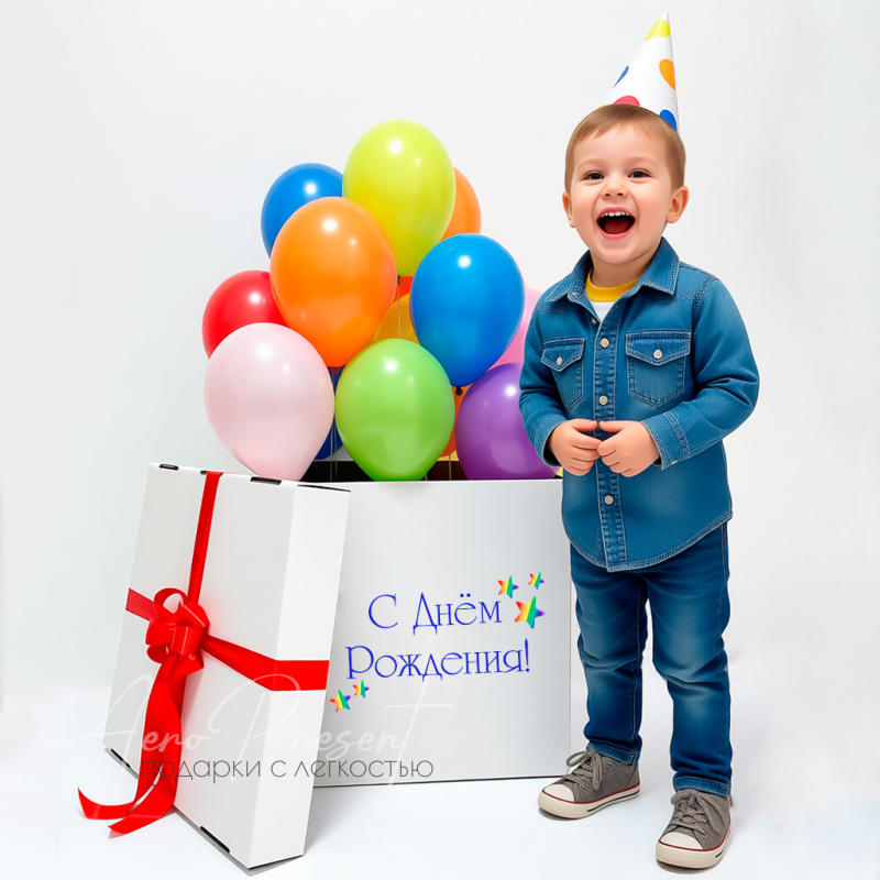 - Наполнение: 10 воздушных разноцветных шаров с гелием, размер шаров 23-25 см.
