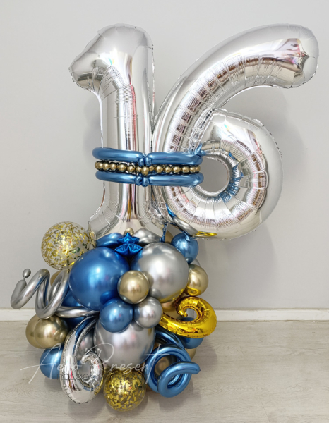 Идеальный вариант для оформления дня рождения дома, в ресторане, в качестве подарочной композиции в офис для коллеги. Высота композиции около 140-150 см., композиция может стоять как на полу, так и на столе, может служить полноценной фотозоной или частью её.