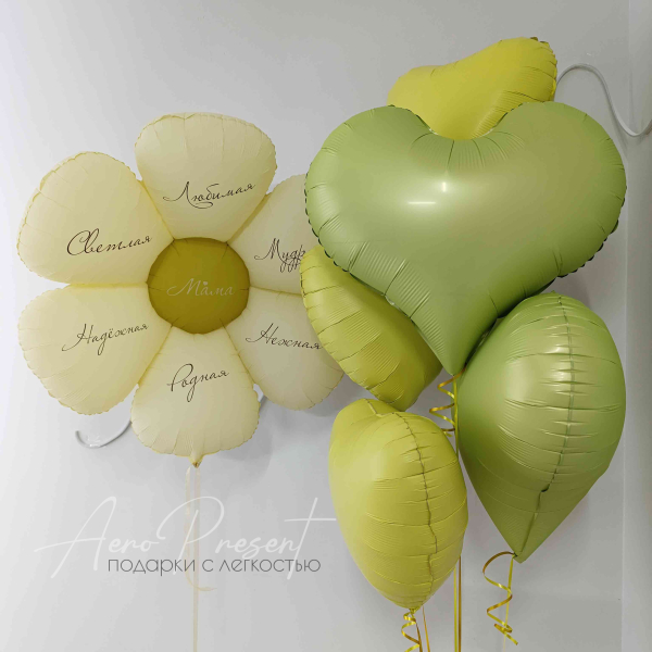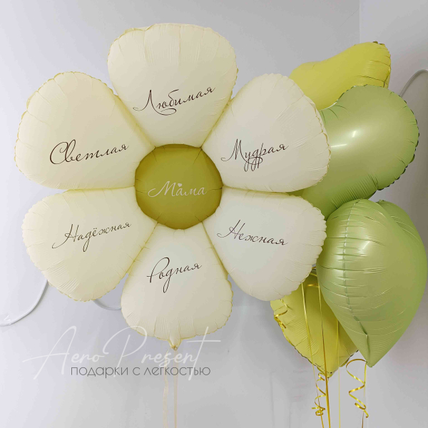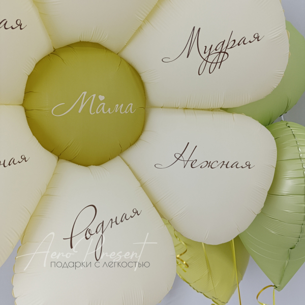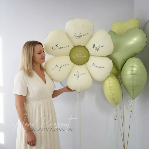 - Фольгированный шар в виде ромашки с комплиментами на лепестках