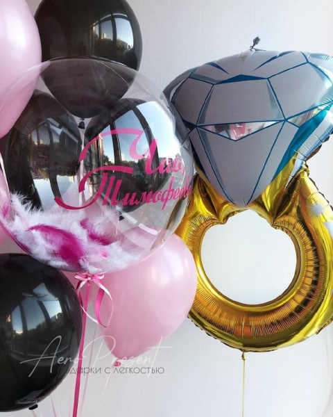 - Пластиковый шар с перьями и индивидуальной написью;