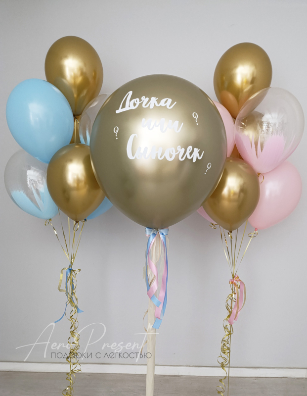 - Гендер шар с наполнением конфетти и маленькими шарами и надписью на нем;