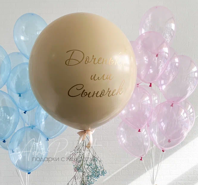 - Гендер шар с наполнением конфетти и маленькими шарами и надписью на нем;