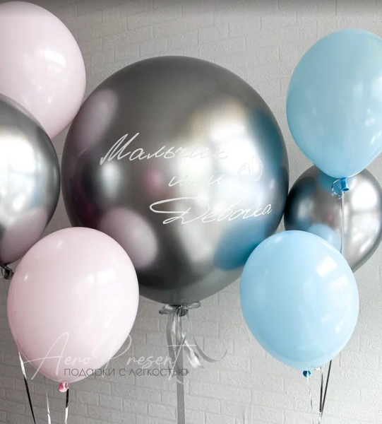 - Гендер шар с наполнением конфетти и маленькими шарами и надписью на нем;