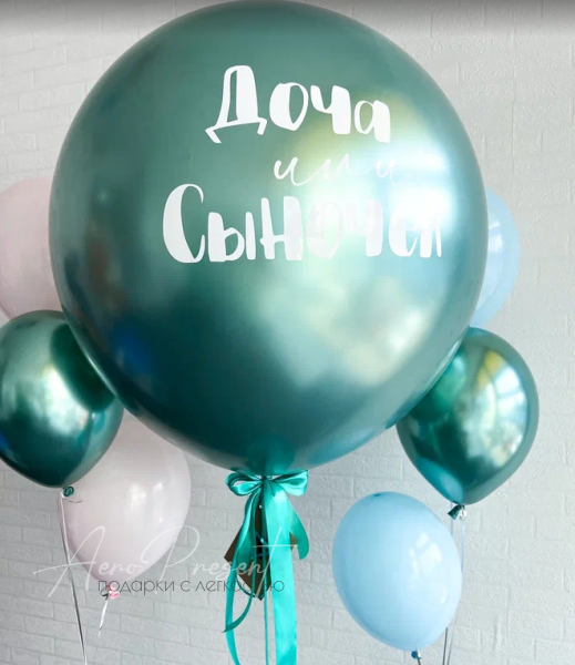 - Гендер шар с наполнением конфетти и маленькими шарами и надписью на нем;