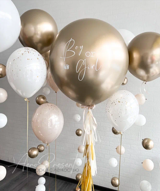 - Гендер шар с наполнением конфетти и маленькими шарами и надписью на нем;