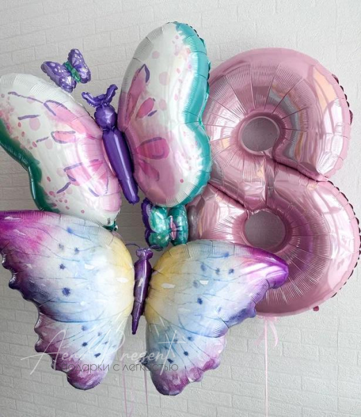 В составе набор два фольгированных шара бабочки и фольгированная цифра