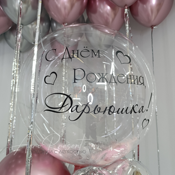 - Прозрачный бабл шар с надписью, наполненный перьями