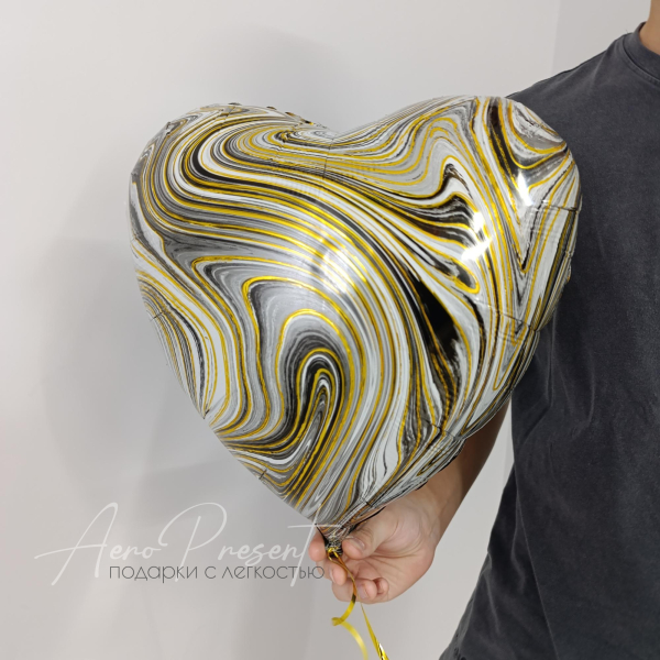 Фольгированный шар с гелием в виде сердца мраморного черно-золотого окраса.