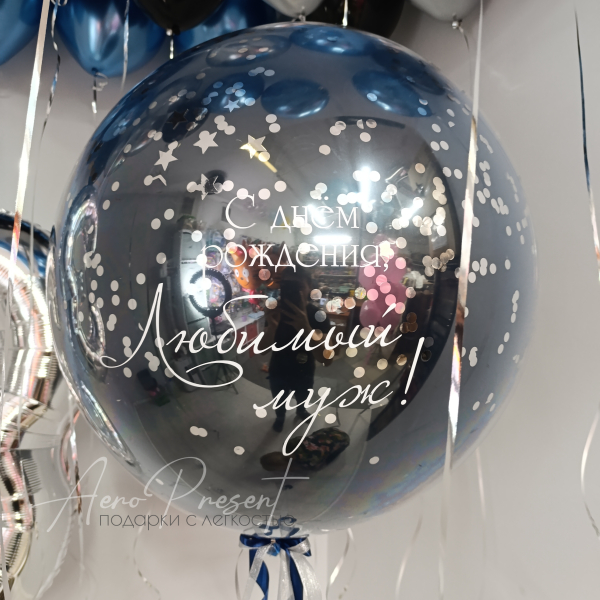 - Двойной прозрачный шар с декором блестками и поздравительной надписью;