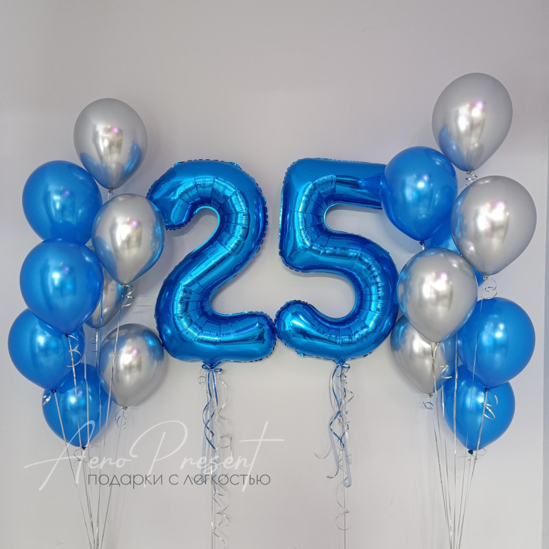 - 2 букета из воздушных шаров синего цвета и серебристого хрома