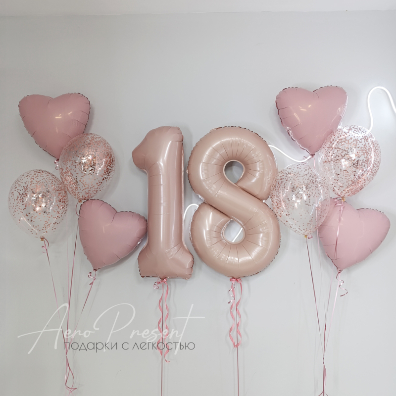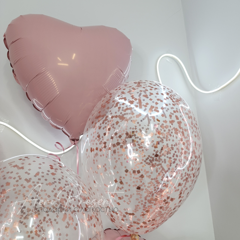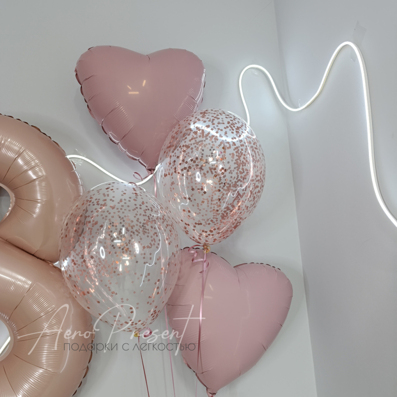 - 2 букета шаров с наполнением конфетти и фольгированными сердцами розового цвета