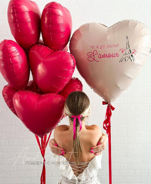 Набор состоит из 8 фольгированных сердец и гигантского сердца 75 см. с дизайнерским нанесением