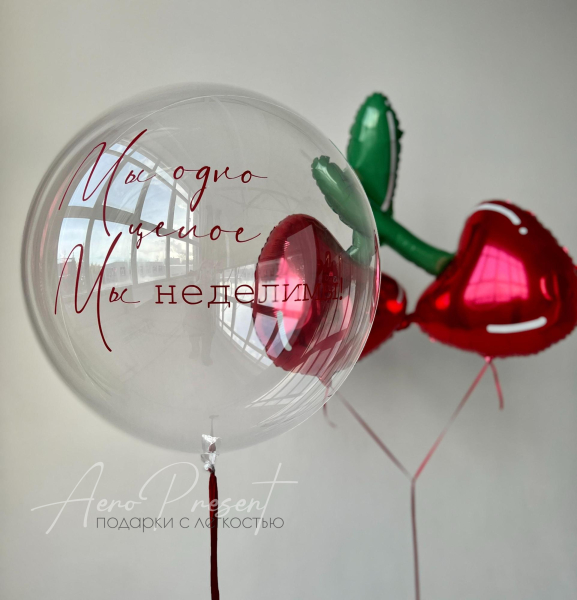 Чудеснейшая композиция с оригинальным шаром баблсом с надписью "Мы одно целое, Мы неделимы!" и фольгированным шаром вишенками.