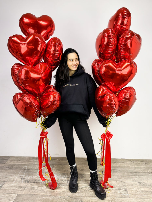 Два пышных букета из воздушных шаров в форме ярко-красных сердец создадут восхитительное настроение и подчеркнут ваши искренние чувства.