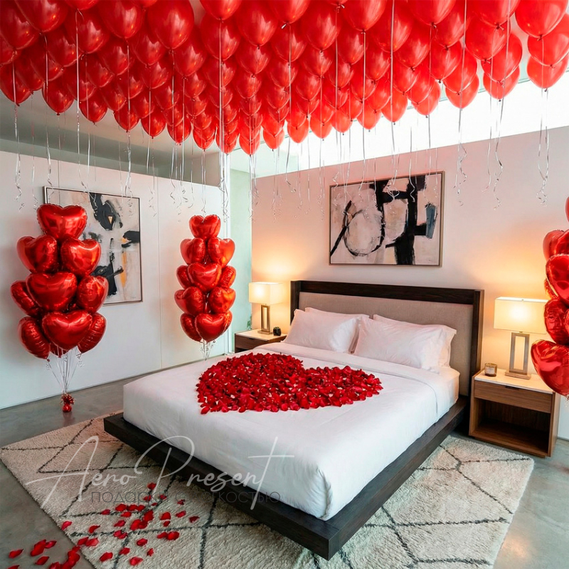 Потолок полностью усыпан красными шарами, по углам — высокие букеты алых сердец, а кровать украшена сердцем из лепестков роз.